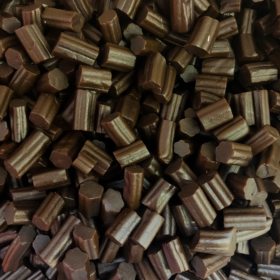 Small pieces of delicious black liquorice. These are cut into bite-sized bits so great for snacking! Grab a handful and try some today.Â