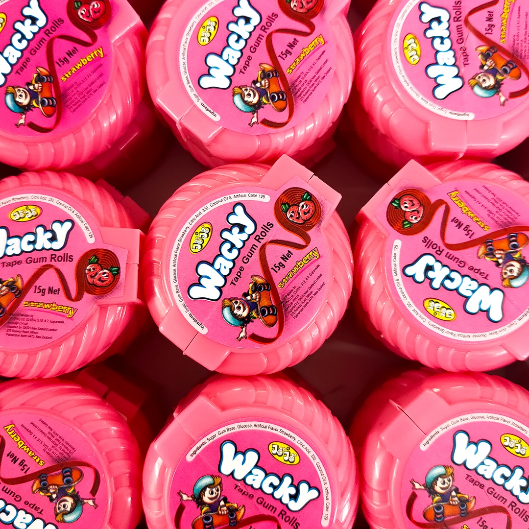 Everybody goes wacky for wacky tape! This popular bubblegum treat comes rolled in a small plastic container, with four different fun-filled fruit flavours to choose from.Â